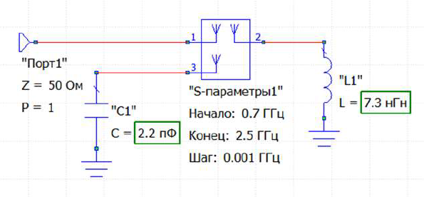 После электромагнитного расчета антенны ее S-параметры были импортированы в режим схемотехнического анализа. По результатам анализа КСВН определены параметры согласующей цепи.