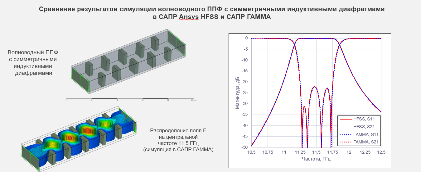 Отдельно отметим производительность расчетов. Расчеты в САПР «ГАММА» сопоставимы с результатами Ansys HFSS по точности и времени, а для определенных классов задач даже превосходят по скорости.