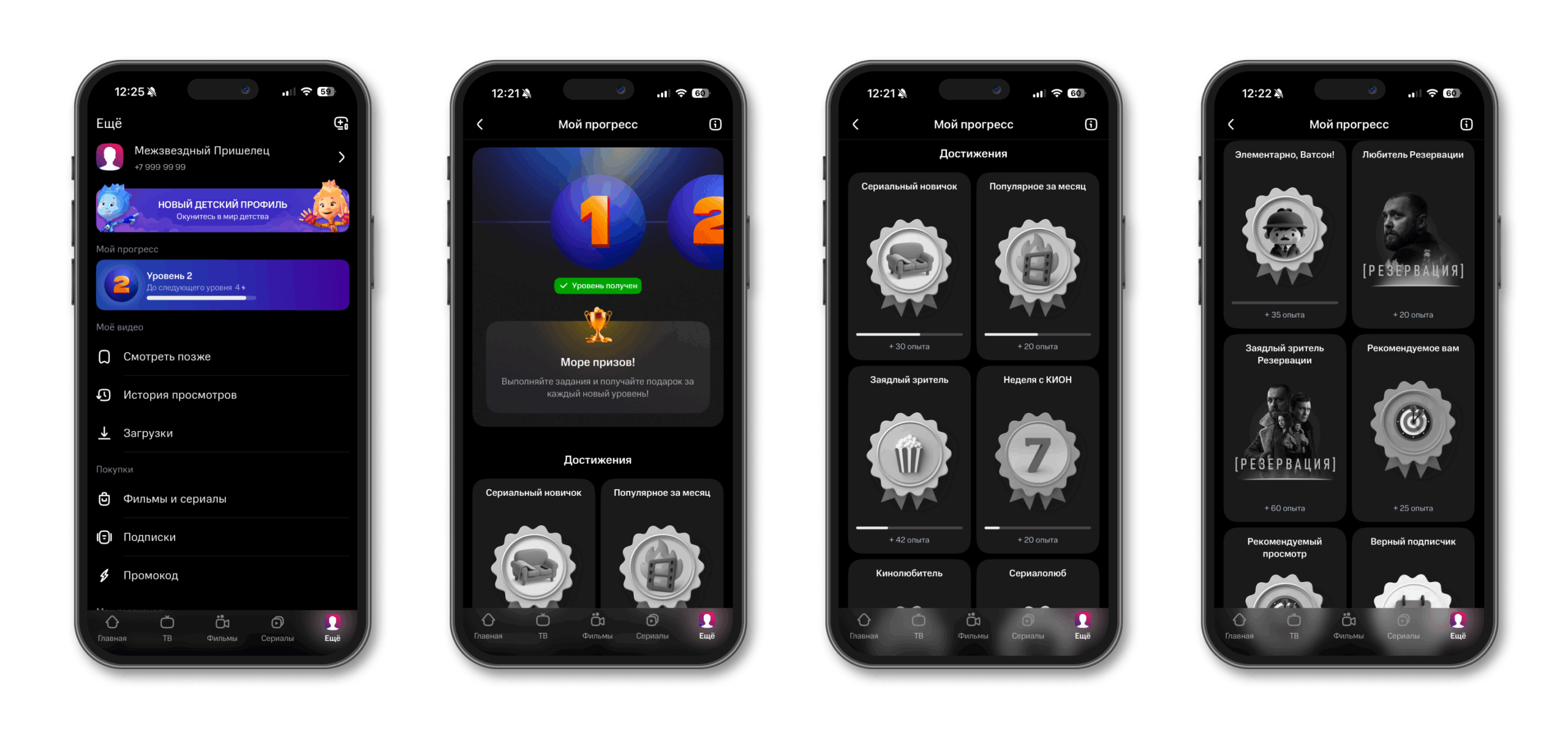 Механика построена на системе достижений и опыта, которые начисляются за обычную активность в приложении. Например, просмотр пяти серий приносит пользователю звание «Сериальный новичок» и 30 единиц опыта, а пять фильмов или десять серий отмечаются достижением «Заядлый зритель» с бонусом в 42 опыта. Существуют и тематические награды, такие как «Король комедии» или «Любитель «Резервации», приуроченные к конкретным жанрам или проектам платформы.