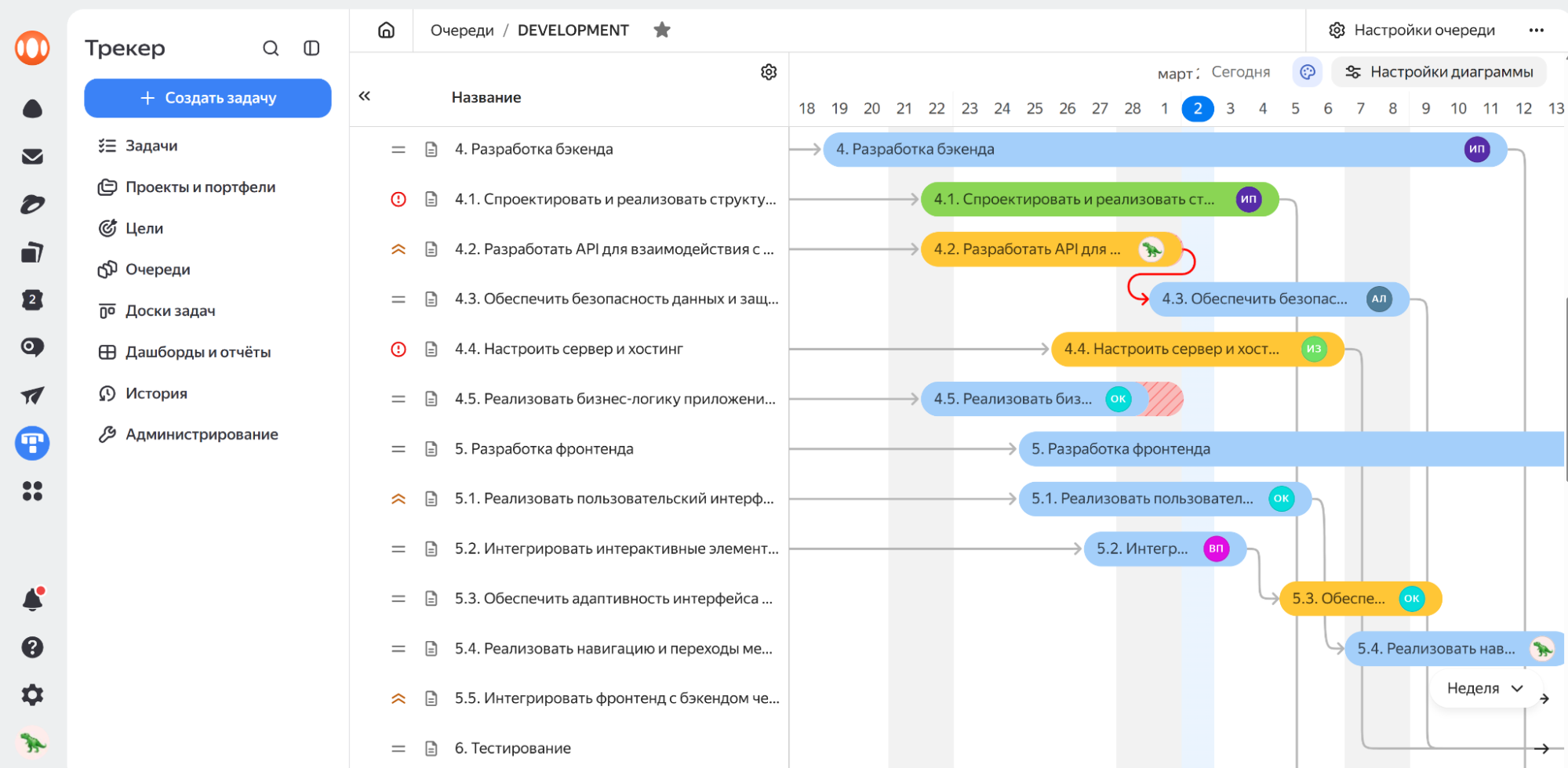 Для более детального управления задачами и проектами доступны диаграммы Ганта. Они отображают задачи на временной шкале, показывая их статус, длительность и взаимосвязи. Это особенно полезно, когда в проект интегрированы несколько команд и важно понимать, на каком этапе находится каждая часть работы. Обновлять сроки, взаимосвязи задач исполнителей и параметры задач можно прямо с диаграммы, без перехода в карточки.