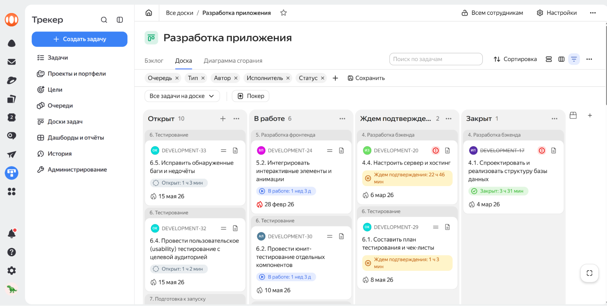 Для наглядного управления работой в Трекере используются доски — визуальные панели, на которых отображаются карточки задач из одной или сразу нескольких очередей. На доске можно группировать, фильтровать и сортировать задачи по различным полям, например, исполнителю, тегам, типу, а также выбирать поля для карточки задачи, что позволяет настроить наиболее удобное представление задач.