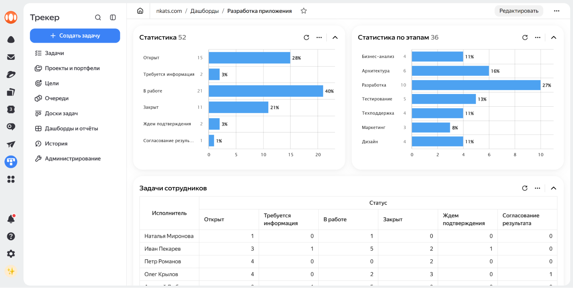 Аналитику и отчетность дополняют дашборды — страницы с набором настраиваемых виджетов. Они позволяют собрать на одном экране ключевые показатели: списки задач, сводные таблицы, графики, статистику по выполнению, динамику создания и закрытия заявок, время цикла и поток задач. Такой формат удобен для владельцев процессов, руководителей и тимлидов, которым важно видеть общую картину без погружения в детали.
