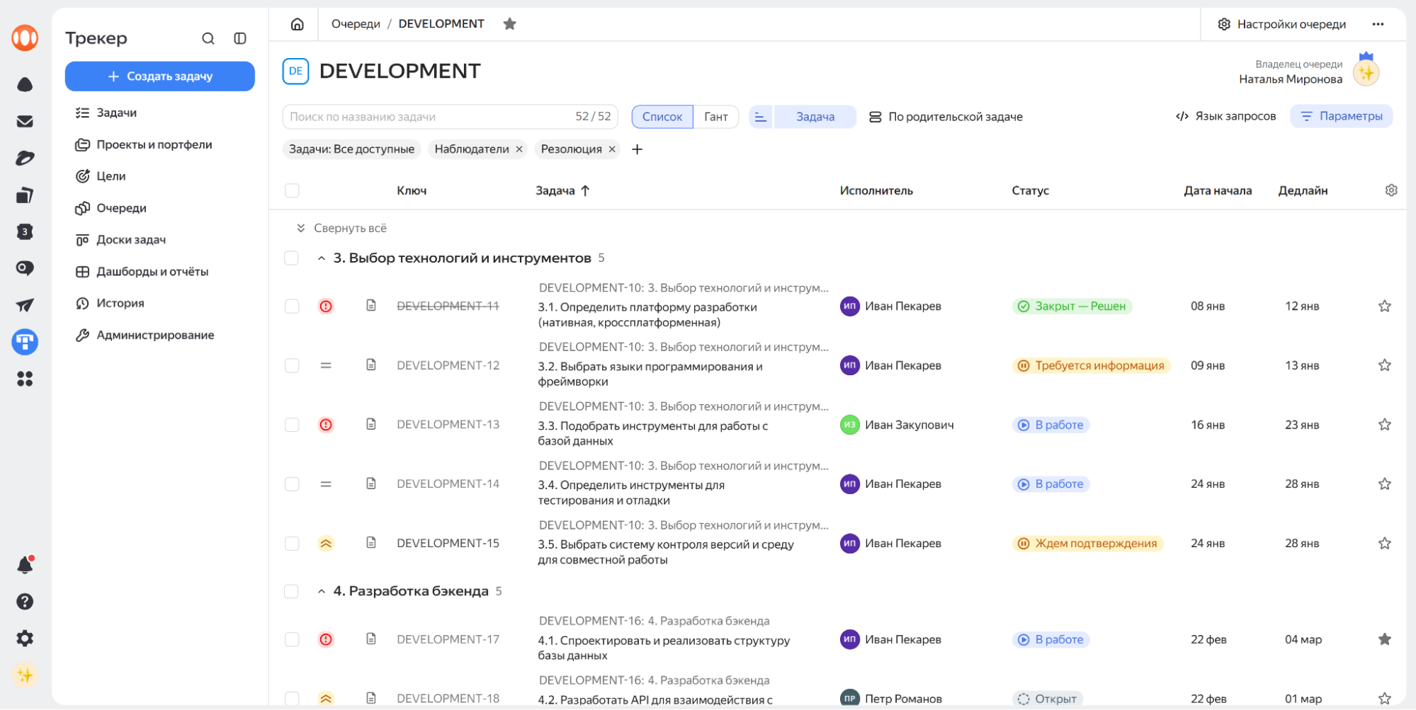 Очереди в Яндекс Трекере представляют собой обособленные рабочие пространства, в которых находятся задачи, объединенные общим признаком. Например, очередь задач сотрудников юридического отдела или очередь задач процесса закупки или очередь задач команды какого-либо проекта.