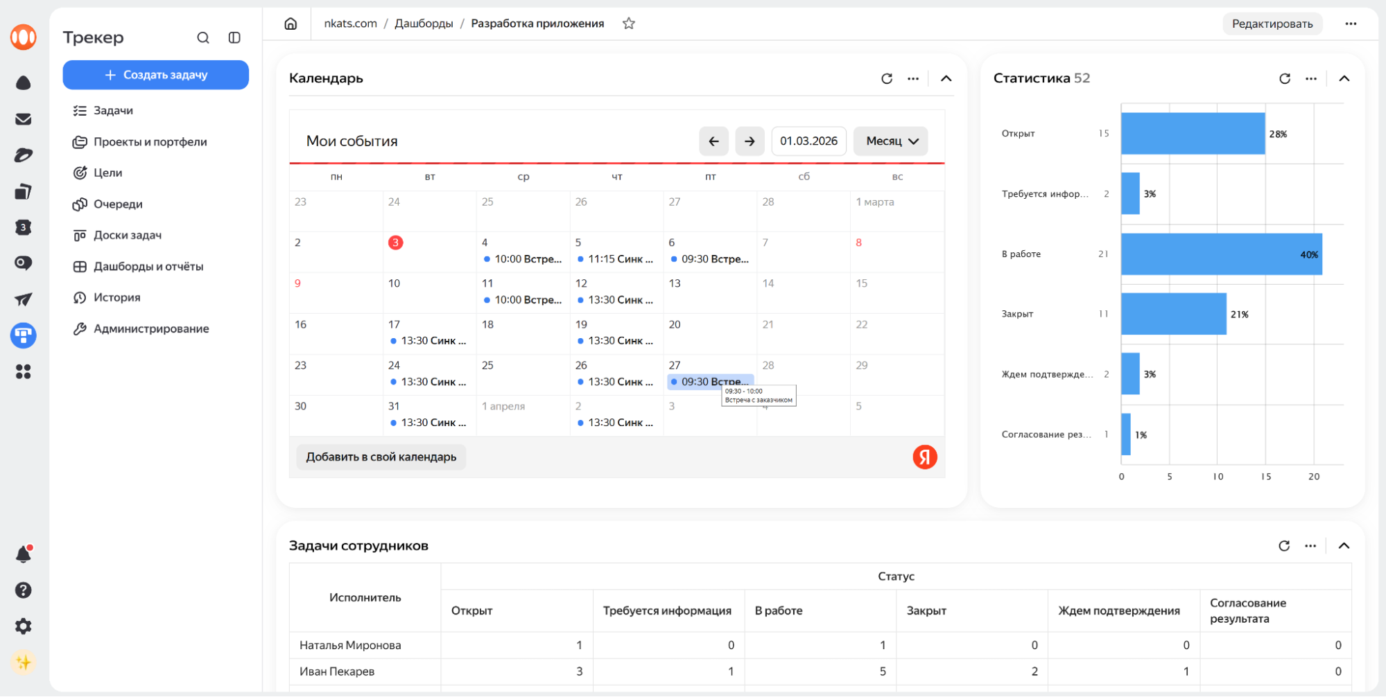 - Интеграция в экосистему Яндекс 360. Трекер органично встраивается в корпоративную среду Яндекса 360 и может использоваться совместно с Почтой, Календарем, Мессенджером, Формами и другими сервисами. Это упрощает коммуникацию, связывает задачи с обсуждениями и документами и формирует единое цифровое рабочее пространство без необходимости переключаться между разрозненными инструментами.