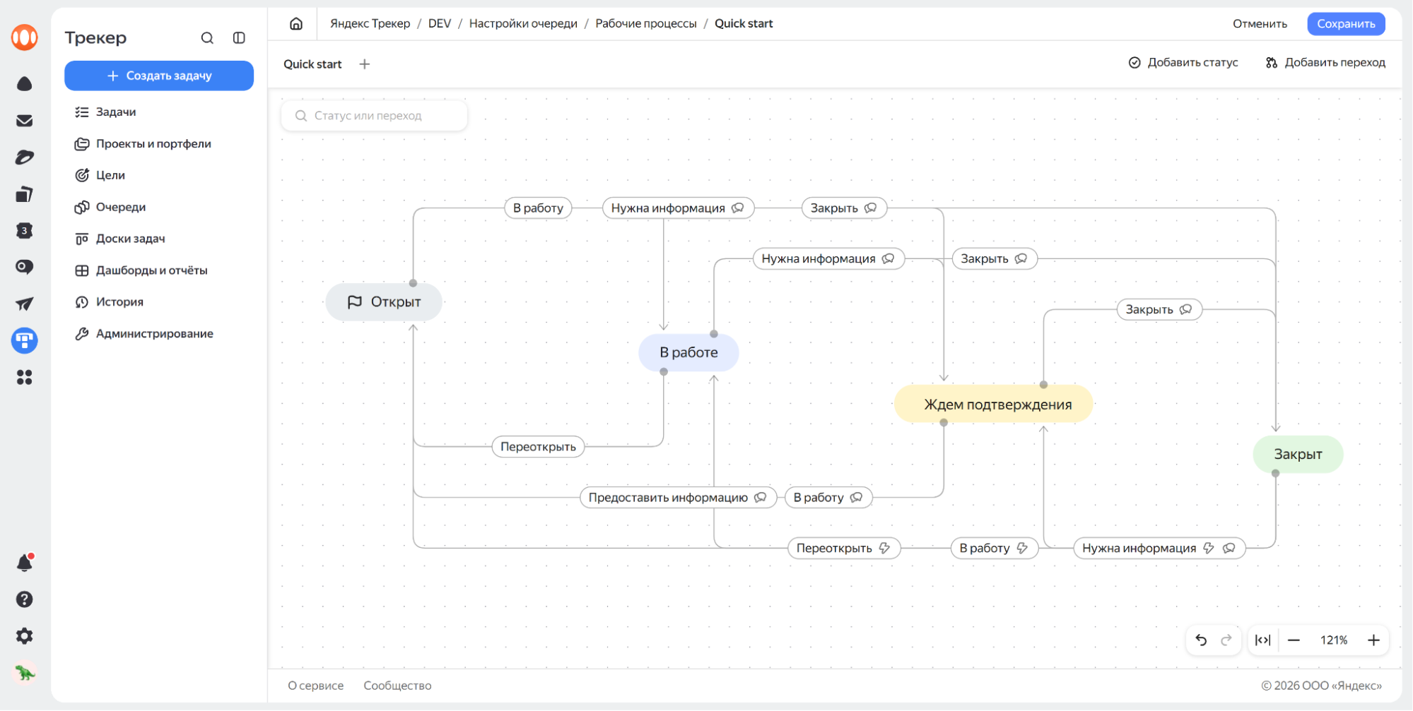 Для очереди можно настраивать рабочие процессы, которые применяются к определенным типам задач. В ходе работы задача проходит через несколько статусов — рабочий процесс позволяет определить правила для перехода между статусами. На переходы можно настроить автоматическое действие и экраны, запрашивающие у пользователя заполнение обязательных полей.