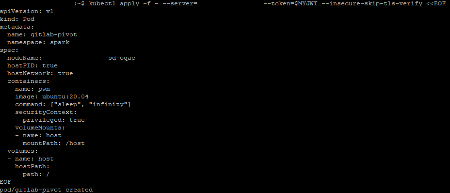 Следующим шагом мы решили проверить, валиден ли найденный токен и какие возможности он дает внутри кластера. Для этого, используя инструмент kubectl, были проверены права учетной записи, в результате чего выявлено наличие разрешений на выполнение всех типов операций — create, update, delete, patch, get, list, watch — в отношении всех типов ресурсов в пространстве имен spark.