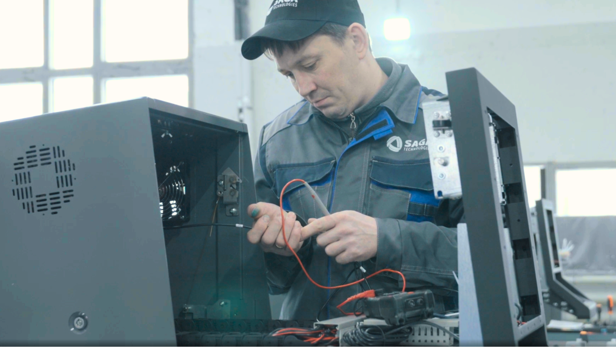 Директор производства «САГА Технологии» Иван Бачков объясняет, что работа над банкоматом начинается задолго до сборки — с проектирования и обработки листового металла и заканчивается выпуском готового устройства.