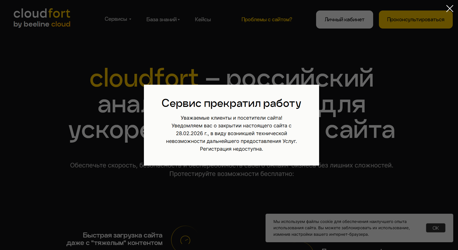 CloudFort официально завершил работу 28 февраля 2026 года в 12:00. После этого времени доступ к личному кабинету пользователей был полностью закрыт.