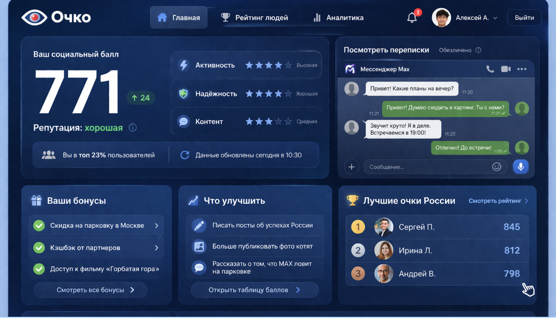 В России ведется разработка сервиса «Очко», который предполагает формирование социального рейтинга граждан на основе их цифрового поведения. Как заявляют создатели, данные для системы будут собираться анонимно из мессенджера МАХ, а затем публиковаться в обезличенном виде.