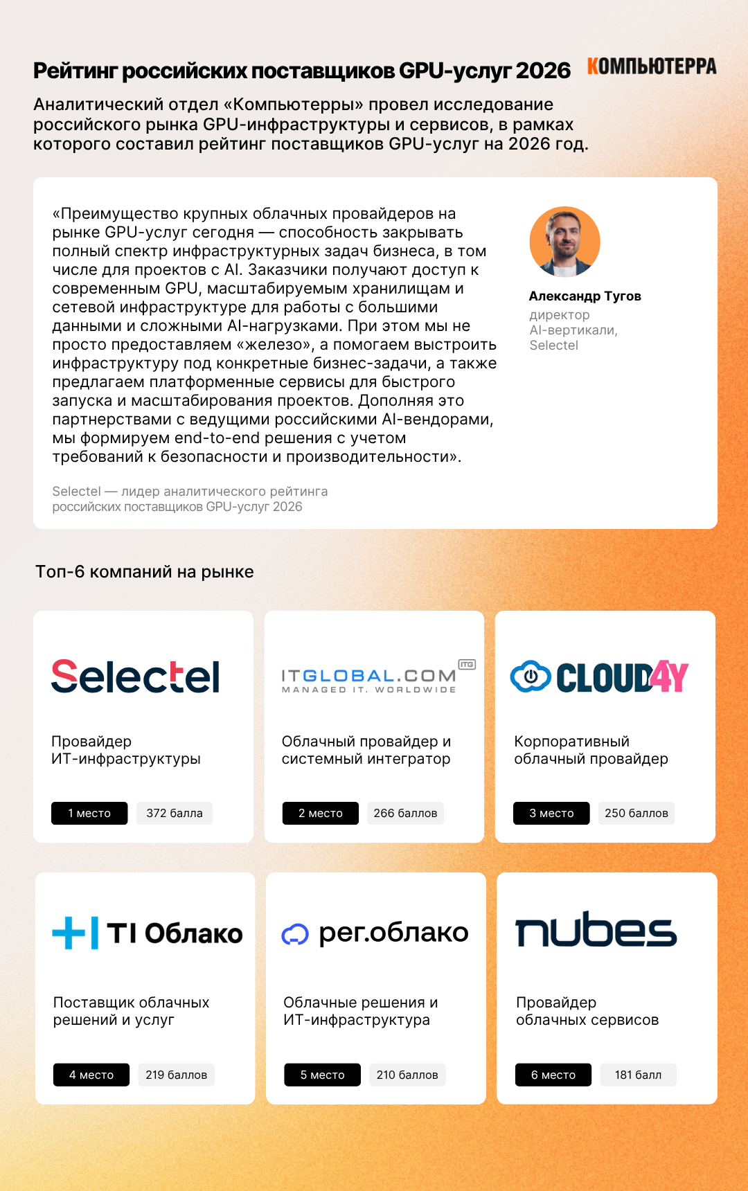 Аналитический отдел «Компьютерры» провел исследование российского рынка GPU-инфраструктуры и сервисов, в рамках которого составил рейтинг поставщиков GPU-услуг на 2026 год.