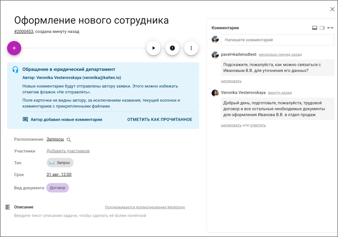 «Кайтен» подходит для HR, бухгалтерии, юридического отдела, снабжения и административных служб. Такой сценарий позволяет собрать внутренние сервисные запросы в одной системе и убрать хаос из разрозненных почтовых ящиков и чатов.