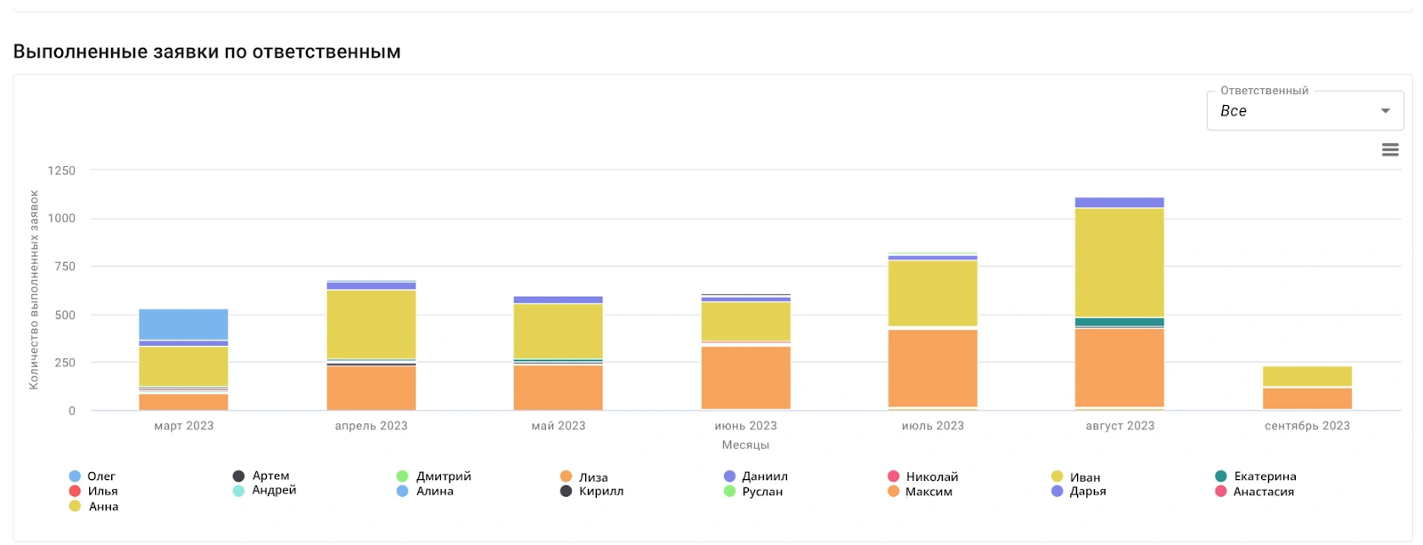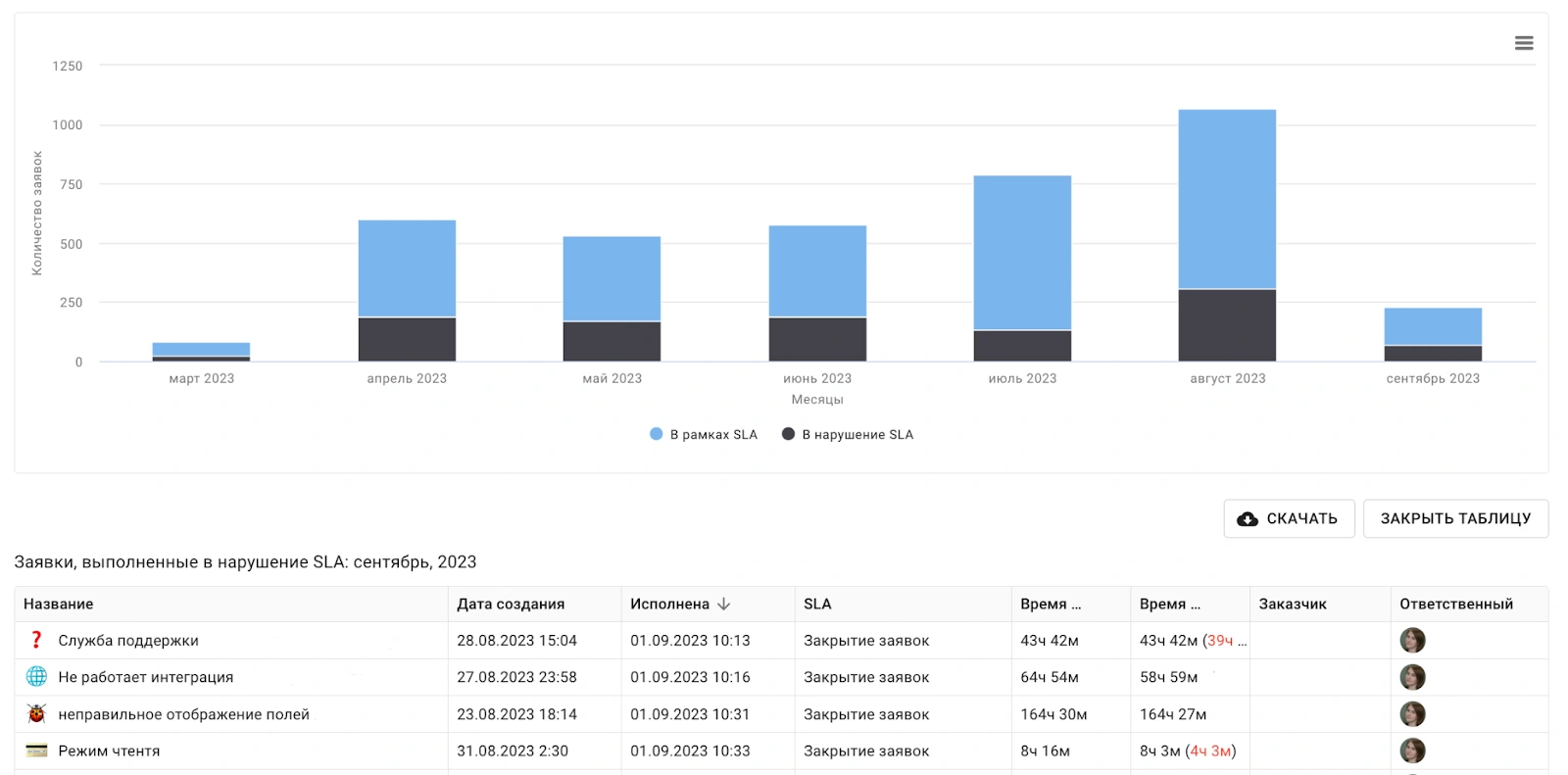 На платформе есть единый дашборд по всем обращениям, табличный отчет со всеми параметрами, динамика заявок по месяцам, отчет по выполненным заявкам в разрезе ответственных и отслеживание удовлетворенности клиентов. Такой набор помогает оценивать не только нагрузку, но и фактическое качество сервиса.