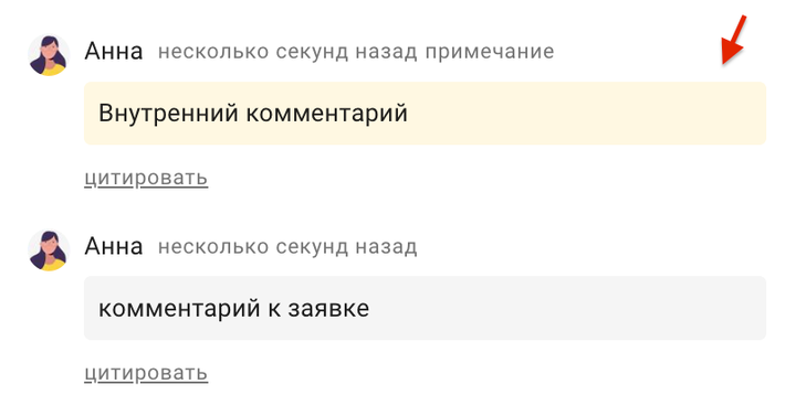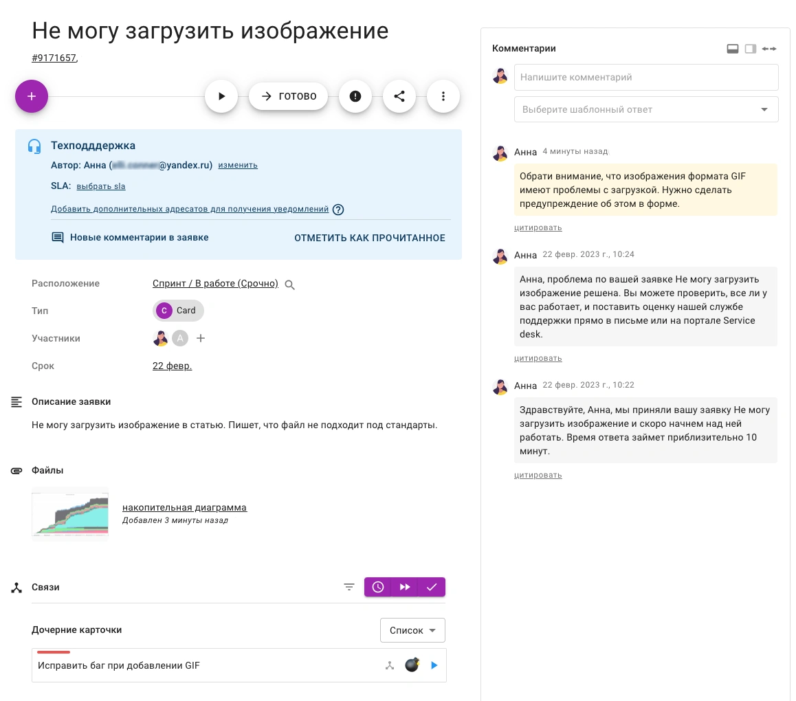 В карточке хранятся данные о заказчике, срок выполнения, описание запроса, дополнительные поля, вложенные файлы, связанные задачи и заметки специалиста. Здесь же можно отвечать пользователю, не переключаясь на другие каналы, причем внутренние заметки остаются невидимыми для заказчика.