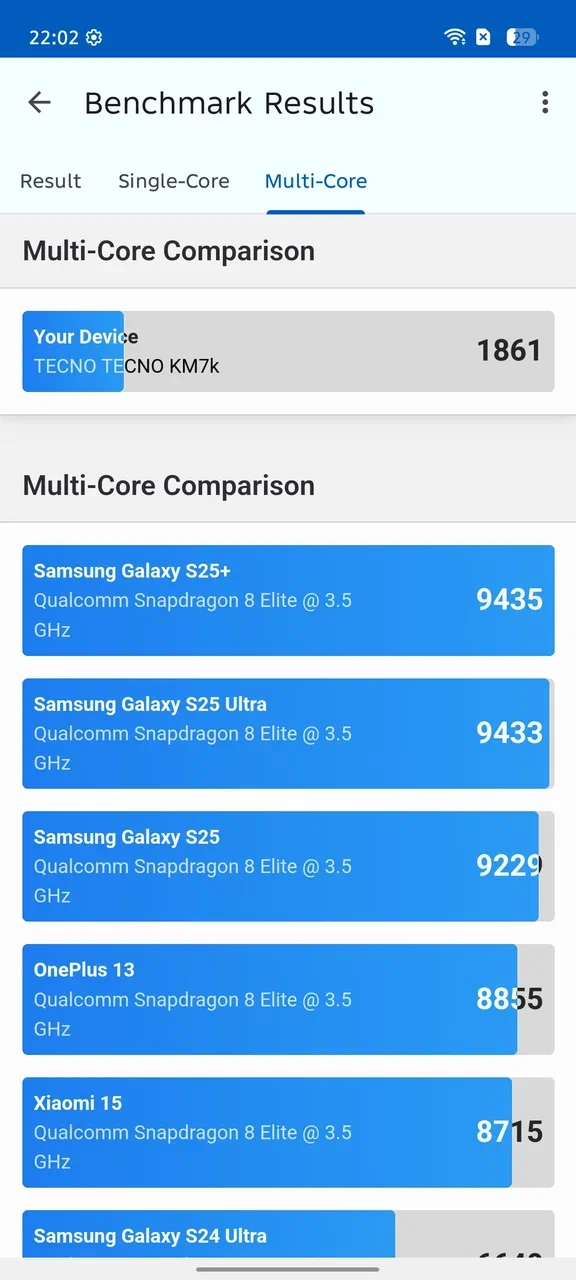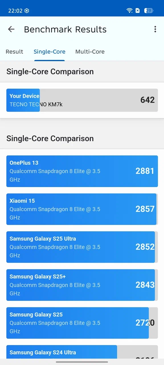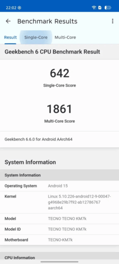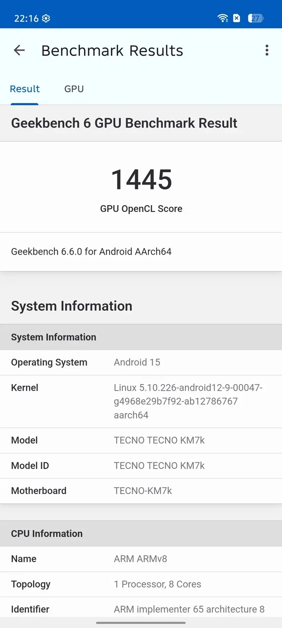 Чтобы понять, как Tecno Spark Slim ведет себя в реальных сценариях, мы прогнали его через Geekbench. Этот тест хорошо показывает базовый уровень производительности и помогает оценить, насколько уверенно смартфон справляется с повседневными задачами.