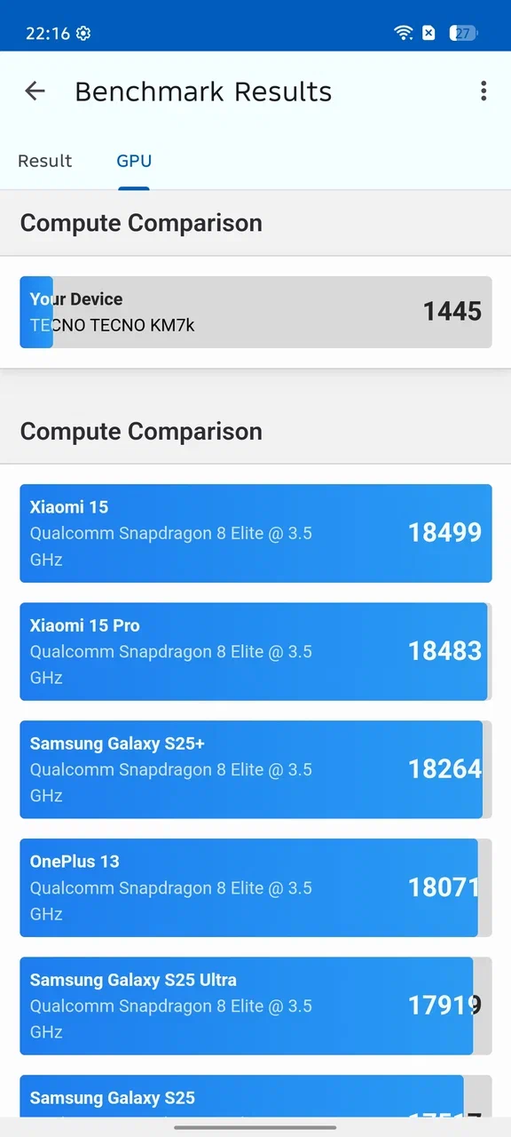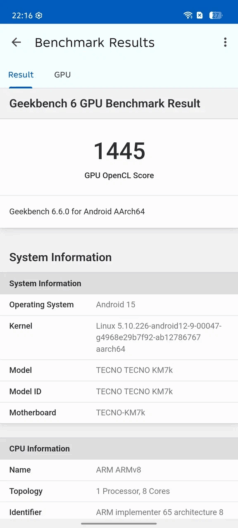 Отдельно мы проверили и графическую подсистему в Geekbench GPU с тестом OpenCL. Здесь смартфон показал 1445 баллов. Этот результат дает представление о том, как устройство справляется с обработкой графики, рендерингом интерфейса и нагрузкой в мобильных играх. Запас, конечно, не флагманский, но для своего класса показатель вполне рабочий. Это значит, что смартфон без проблем тянет большинство приложений, а игры в целом идут нормально, если не выкручивать графику на максимум.