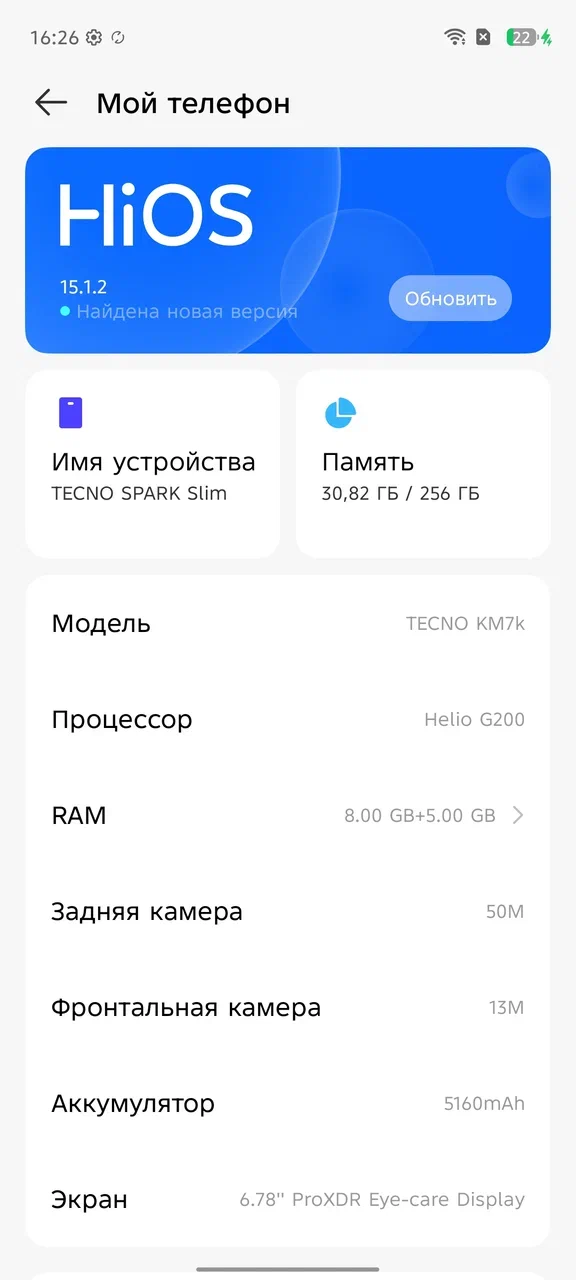 Работает Tecno Spark Slim на Android 15 с фирменной оболочкой HiOS. Она добавляет дополнительные возможности кастомизации и системные настройки, связанные с управлением, внешним видом интерфейса и оптимизацией работы устройства. Пользователь может менять оформление, настраивать жесты и подбирать параметры системы под себя, не выходя за пределы штатных средств оболочки.