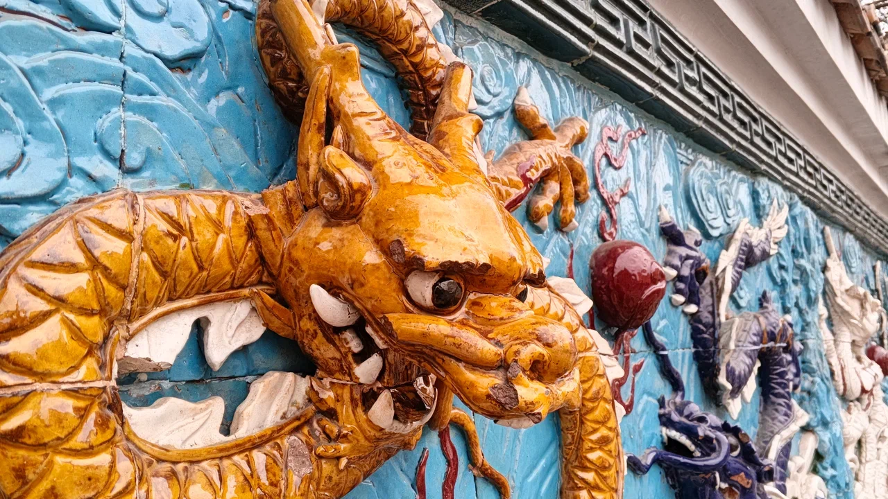 На снимке декоративной стены видно, что камера передает и насыщенные цвета. Золотистые элементы фигуры дракона выглядят не сильно яркими, но контрастными на фоне голубой керамической поверхности стены. Из плюсов, оттенки все такие же естественные, что говорит о корректной работе алгоритмов обработки изображения.