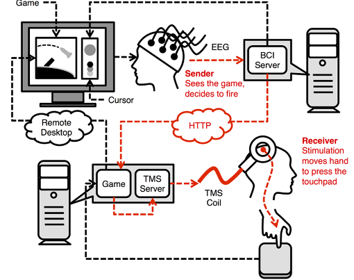 Первое в истории прямое общение «мозг-мозг» между двумя людьми состоялось в Сиэтле. Раджеш Рао сидел перед компьютерной игрой, где нужно было вообразить выстрел из пушки. Его коллега Андреа Стокко в другом конце кампуса в шумоподавляющих наушниках не видел игру. В момент, когда Рао вообразил выстрел, EEG-система уловила характерное подавление мозговых ритмов (мю-ритм в диапазоне 8–13 Гц), декодировала это как команду «огонь» и передала сигнал на TMS-катушку у головы Стокко. Правая рука Андреа дернулась непроизвольно — как будто управляемая дистанционно.