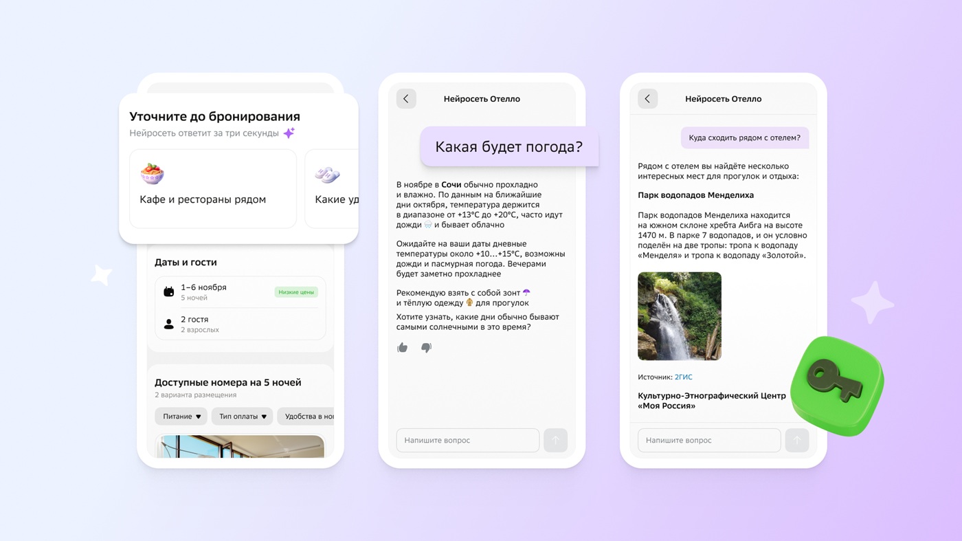 Как пояснила менеджер продукта «Отелло» Дарья Резанова, основная задача — упростить подготовку к поездке. Чтобы избежать недостоверных данных, нейросеть использует только проверенные источники: информацию от отелей и партнеров, а также справочные данные и отзывы из сервиса 2ГИС.