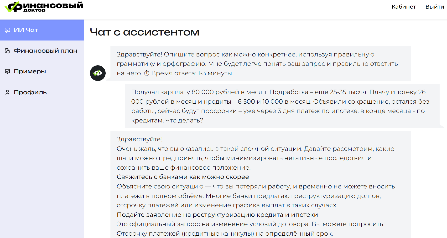 Представим Матвея — он работает продавцом в сетевом магазине и получает 80 тыс. рублей в месяц. При этом он периодически помогает друзьям делать простые сайты — это еще 30 тыс. рублей за 1–2 заказа в месяц. Доход стабильный, так что Матвей легко оплачивает без просрочек ипотеку в 26 тыс. рублей в месяц и два потребительских кредита — 6,5 тыс. и 10 тыс. рублей в месяц. Однако Матвея внезапно сокращают на основной работе. Пока новой работы нет, кредиты платить возможности нет. С этой ситуацией он приходит к ИИ-ассистенту.