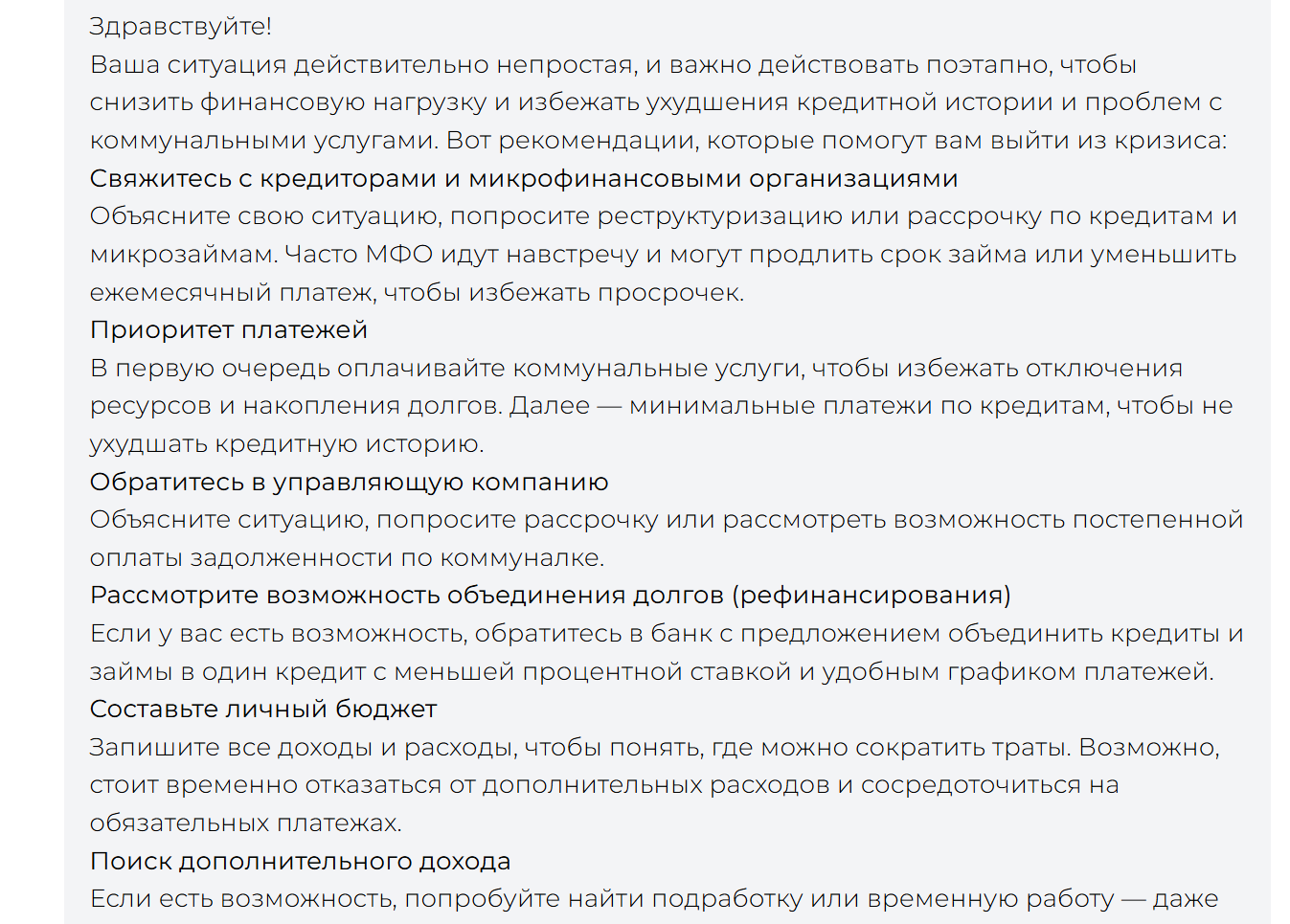 Чат-бот сообщил, что нужно связаться с МФО (они способны продлить срок займа), взять рассрочку по квартплате, разобраться с бюджетом и приоритезировать платежи. Плюс к этому можно сделать вычет до 15,6 тыс. рублей от максимально возможной суммы за медицинские услуги в 120 тыс. рублей, главное — собрать все чеки.