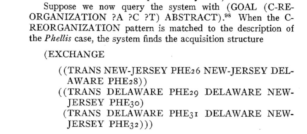 В течение того же десятилетия Л. Торн Маккарти создал соответствующее программное обеспечение, которое описал в этой статье: «Я опишу написанную мной компьютерную программу, которая моделирует определенные аспекты концептуальных структур, встречающихся в конкретной области права — налогообложении корпоративных реорганизаций, изложенном в подглаве C главы 1 Налогового кодекса США 1954 года. Программа, названная по мнемоническому принципу TAXMAN, способна выполнять очень примитивную форму «юридического мышления»: получив «описание» «фактов» дела о корпоративной реорганизации, она может выработать «анализ» этих фактов на основе нескольких юридических «концепций». Я подробно опишу, как работает эта программа, каковы ее ограничения и как ее можно было бы доработать и переписать для достижения несколько более высокого уровня сложности. Внимательно изучая как достоинства, так и недостатки конкретной формальной модели конкретной области права, я надеюсь в конечном итоге получить некоторое представление о структуре и динамике юридических концепций в целом. Настоящая работа также имеет практическую цель…».