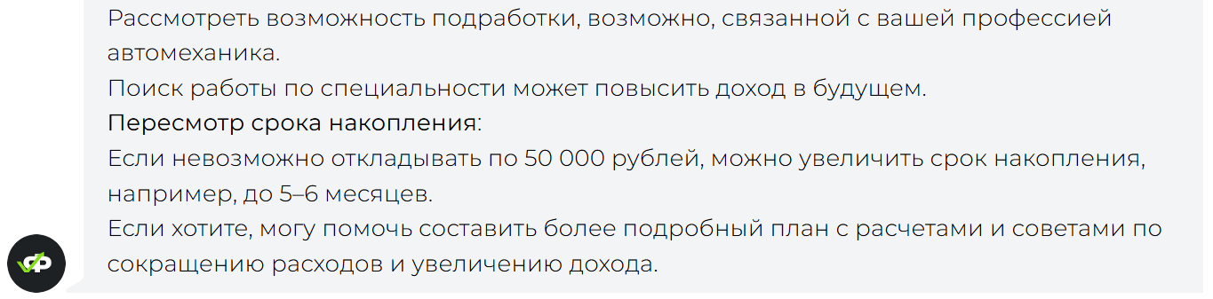 Внезапно (нет) оказалось, что при таком доходе не получится откладывать 50 тыс. в месяц, поэтому путем переговоров получилось наметить план. ИИ посоветовал срок увеличить до 5 месяцев, чтобы откладывать 30 тыс., а также попробовать сначала выйти на подработку, а затем и вовсе сменить работу, ведь автомеханик сможет смело рассчитывать на 100-120 тыс. рублей в месяц. Так что пожелаем нашему вымышленному герою удачи.
