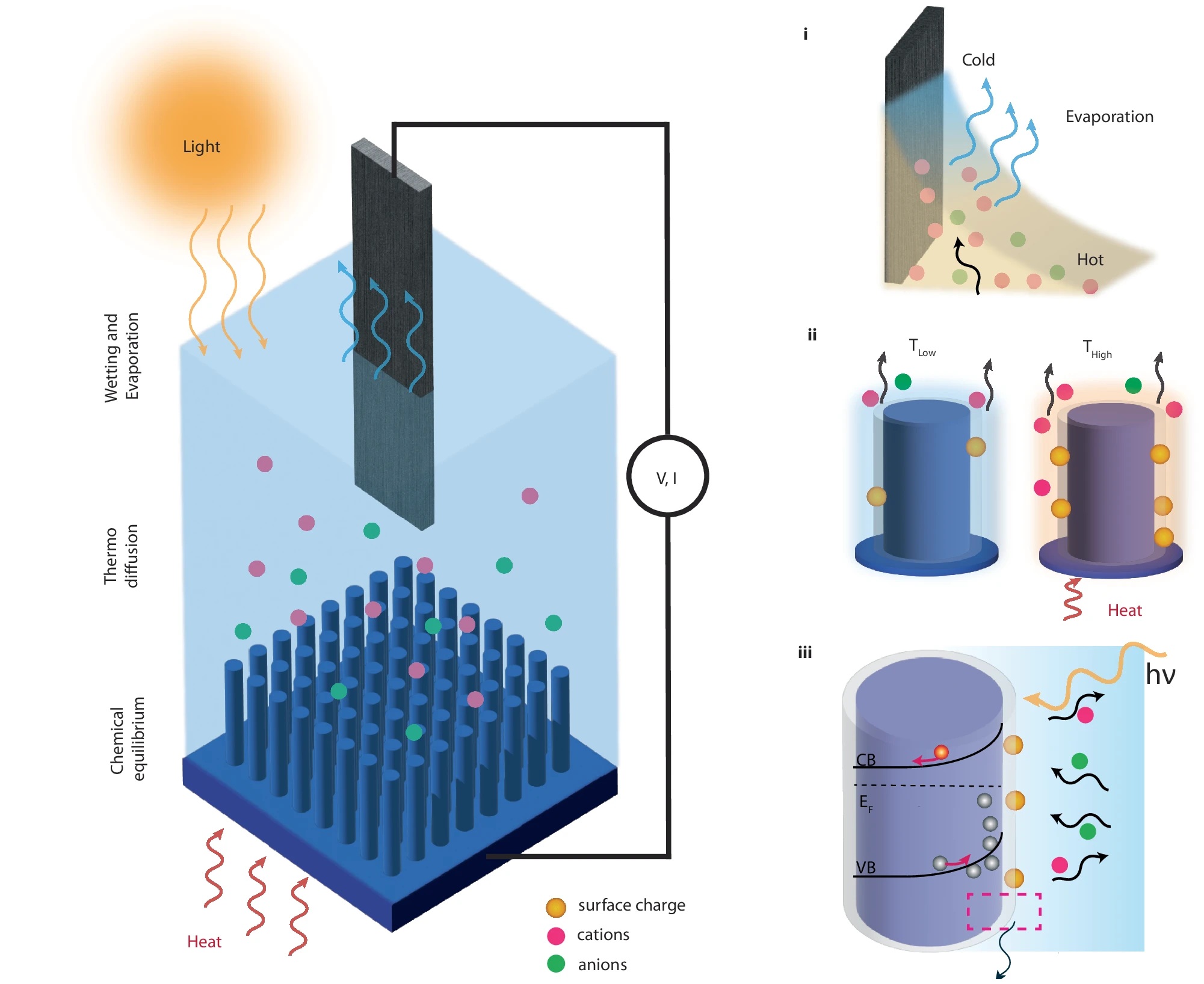 Главное отличие разработки в том, что тепло и свет не просто ускоряют испарение, а управляют движением частиц. Свет возбуждает электроны в кремнии, а тепло усиливает отрицательный заряд на поверхности устройства. Одновременно с этим из-за нагрева в соленой воде ионы начинают смещаться, создавая разделение положительных и отрицательных зарядов. Это порождает электрическое поле, которое заставляет возбужденные электроны двигаться по цепи. Так возникает ток.